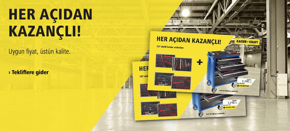 Çevrimiçi KAISER+KRAFT Türkiye mağazasında ihtiyaç duyduğunuz hemen hemen her şeyi bulabilirsiniz. Size sadece Kärcher yüksek basınçlı temizleme cihazları, Rau çalışma tezgahları veya Zarges merdivenleri sunmakla kalmıyor, aynı zamanda çoğu "made in Germany" olan kendi performans markalarımızla da tanıştırıyoruz. Örneğin, EUROKRAFT'ın sunduğu 5 yıl süreli satış sonrası tedarik hizmeti ve 10 yıllık premium ürün kalitesi sayesinde planlamalarınızı güvenle yapabilirsiniz. EUROKRAFT’ın ayrıca yeşil rengi de var: ACTIVE GREEN müşterilerini ekolojik bilançolu ürünleri ve geri dönüştürülebilir ambalajlarıyla ikna eder. QUIPO, 5 yıllık garanti süresi ve dürüst fiyatlarıyla KAISER+KRAFT’ın uygun markasıdır. Ve OFFICE AKKTIV ile kişisel 5 yıldızlı ofisinize kısa sürede sahip olabilirsiniz.